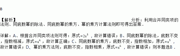A. a5+a5=a10 B. a7÷a=a6 C. a3•a2=a6 D. (﹣a3)2=﹣a6