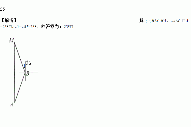 如图,某汽车从A处出发准备开往正北方向M处,但是由于AM之间道路正在整修,所以需先到B处,再到M处,若B在A的北偏东25°,汽车到B处发现,此时正好BM=BA,则汽车要想到达M处,此时应沿北偏西________的方向行驶.
