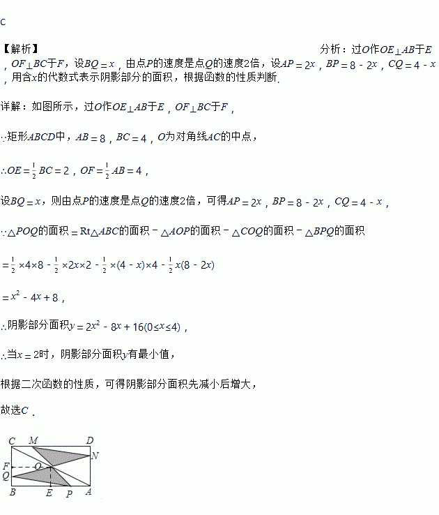 如图,矩形ABCD中,AB=8,BC=4,O为对角线AC的中点,点P,Q分别从A和B两点同时出发,在边AB和BC上匀速运动,并且同时到达终点B,C,连接PO,QO并延长分别与CD,DA交于点M,N,在整个运动过程中,图中阴影部分面积的大小变化情况是( )