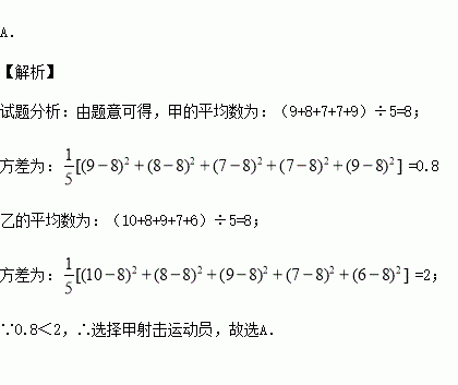 教练要从甲、乙两名射击运动员中选一名成绩较稳定的运动员参加比赛.两人在形同条件下各打了5发子弹,命中环数如下:甲:9、8、7、7、9;乙:10、8、9、7、6.应该选( )参加.