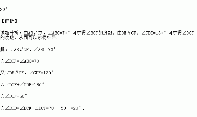 如图,已知AB∥DE∥CF,若∠ABC=70°,∠CDE=130°,求∠BCD的度数。