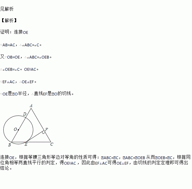 如图,在△ABC中,AB=AC,点O在边AB上,⊙O过点B且分别与边AB、BC相交于点D、E,EF⊥AC,垂足为F.求证:直线EF是⊙O的切线.