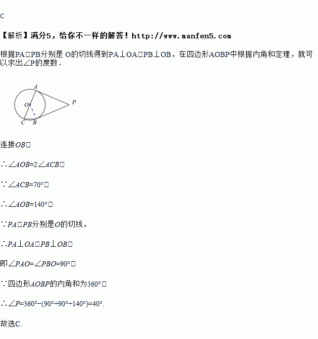 如图,PA,PB是⊙O的切线,点A,B为切点,AC是⊙O的直径,∠ACB=70°,则∠P的度数是( )
