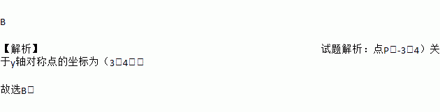 B 【解析】试题解析:点P(-3,4)关于y轴对称点的坐标为(3,4). 故选B.