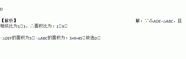 D 【解析】【解析】 ∵△ADE∽△ABC,且相似比为1:3,∴面积比为:1:9. ∵△DEF的面积为5,∴△ABC的面积为:5×9=45.故选D.
