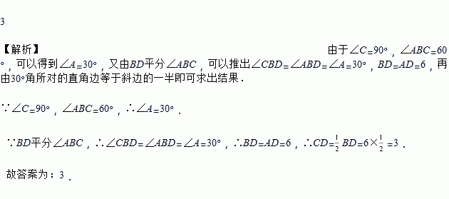 如图,△ABC中,∠C=90°,∠ABC=60°,BD平分∠ABC,若AD=6,则CD=_______.