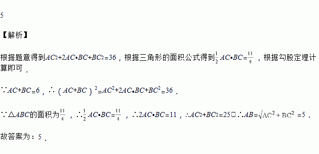 如图,△ABC中,∠C=90°,AC+BC=6,△ABC的面积为cm2,则斜边AB的长是_____cm.