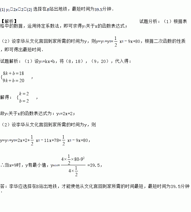 x2-11x+78来描述,请问:李华应选择在哪一站出地铁,才能使他从文化宫回到家所需的时间最短?并求出最短时间.