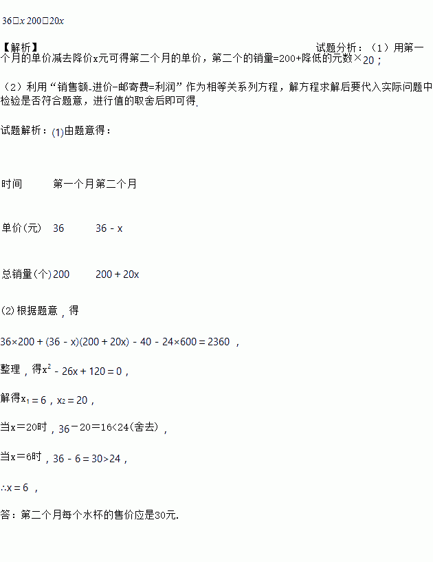 某网店以每个24元的价格购进了600个水杯,第一个月以每个36元销售,售出了200个;第二个月该网店为了增加销量,决定在第一个月价格的基础上降价销售,根据市场调查,单价每降低1元,可多售出20个,但最低售价应高于购进的价格;第二个月结束后,该网店计划将剩余的水杯捐赠某山区,捐赠所需邮寄费共40元,设第二个月单价降低了x元.