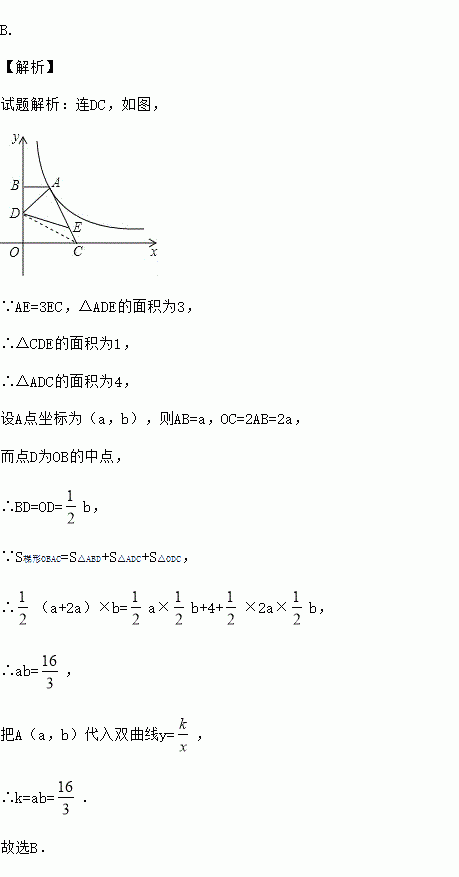的第一象限的那一支上,AB垂直于y轴于点B,点C在x轴正半轴上,且OC=2AB,点E在线段AC上,且AE=3EC,点D为OB的中点,若△ADE的面积为3,则k的值为( )
