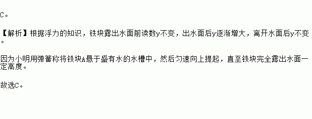 在物理实验课上,小明用弹簧称将铁块A悬于盛有水的水槽中,然后匀速向上提起,直至铁块完全露出水面一定高度,则下图能反映弹簧称的读数y(单位N)与铁块被提起的高度x(单位cm)之间的函数关系的大致图象是【 】