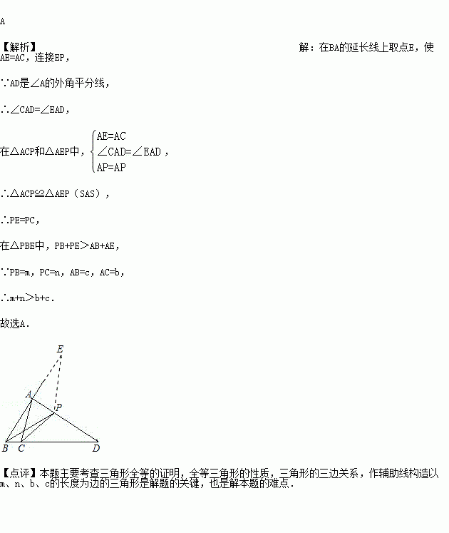 如图,在△ABC中,AD是∠A的外角平分线,P是AD上异于A的任意一点,设PB=m,PC=n,AB=c,AC=b,则(m+n)与(b+c)的大小关系是( )
