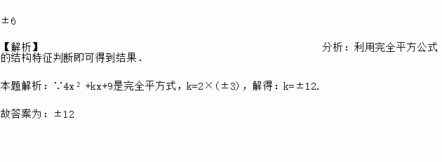 ±6 【解析】分析:利用完全平方公式的结构特征判断即可得到结果. 本题解析:∵4x+kx+9是完全平方式,k=2×(±3),解得:k=±12. 故答案为:±12
