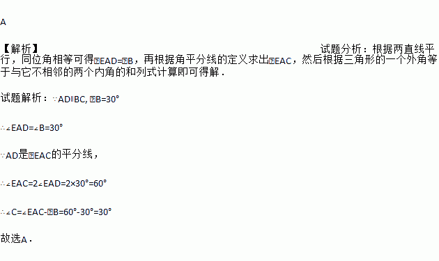如图,AD是∠EAC的平分线,AD∥BC,∠B=30°,则∠C为( )