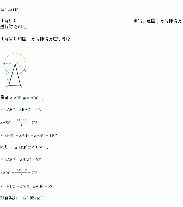 等腰三角形中,顶角为,点在以为圆心,长为半径的圆上,且,则的度数为__________.