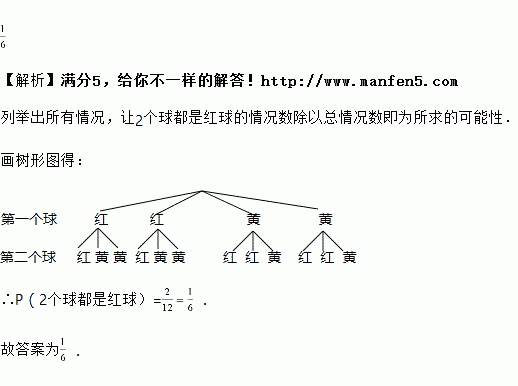 一个袋中有2个红球,2个黄球,每个球除颜色外其余都相同,从中一次摸出2个球,2个球都是红球的概率是________.
