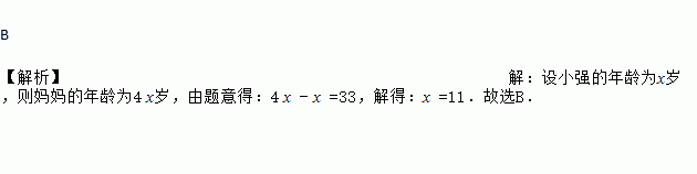 B 【解析】【解析】 设小强的年龄为x岁,则妈妈的年龄为4 x岁,由题意得:4 x - x =33,解得:x =11.故选B.