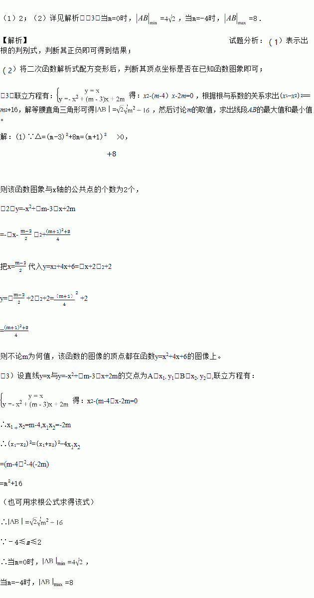 (3)若直线y=x与二次函数图象交于A、B两点,当﹣4≤m≤2时,求线段AB的最大值和最小值。