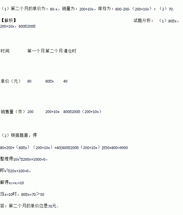 ijÅú·¢ÉÌÒÔÿ¼þ50ÔªµÄ¼Û¸ñ¹º½ø800¼þTÐô£¬µÚÒ»¸öÔÂÒÔµ¥¼Û80ÔªÏúÊÛ£¬ÊÛ³öÁË200¼þ£»µÚ¶þ¸öÔÂÈç¹ûµ¥¼Û²»±ä£¬Ô¤¼ÆÈÔ¿ÉÊÛ³ö200¼þ£¬Åú·¢ÉÌΪÔö¼ÓÏúÊÛÁ¿£¬¾ö¶¨½µ¼ÛÏúÊÛ£¬¸ù¾ÝÊг¡µ÷²é£¬µ¥¼Ûÿ½µµÍ1Ôª£¬¿É¶àÊÛ³ö10¼þ£¬µ«×îµÍµ¥¼ÛÓ¦¸ßÓÚ¹º½øµÄ¼Û¸ñ£»µÚ¶þ¸öÔ½áÊøºó£¬Åú·¢É̽«¶ÔÊ£ÓàµÄTÐôÒ»´ÎÐÔÇå²ÖÏúÊÛ£¬Çå²Öʱµ¥¼ÛΪ40Ôª£¬ÉèµÚ¶þ¸öÔµ¥¼Û½µµÍxÔª£®