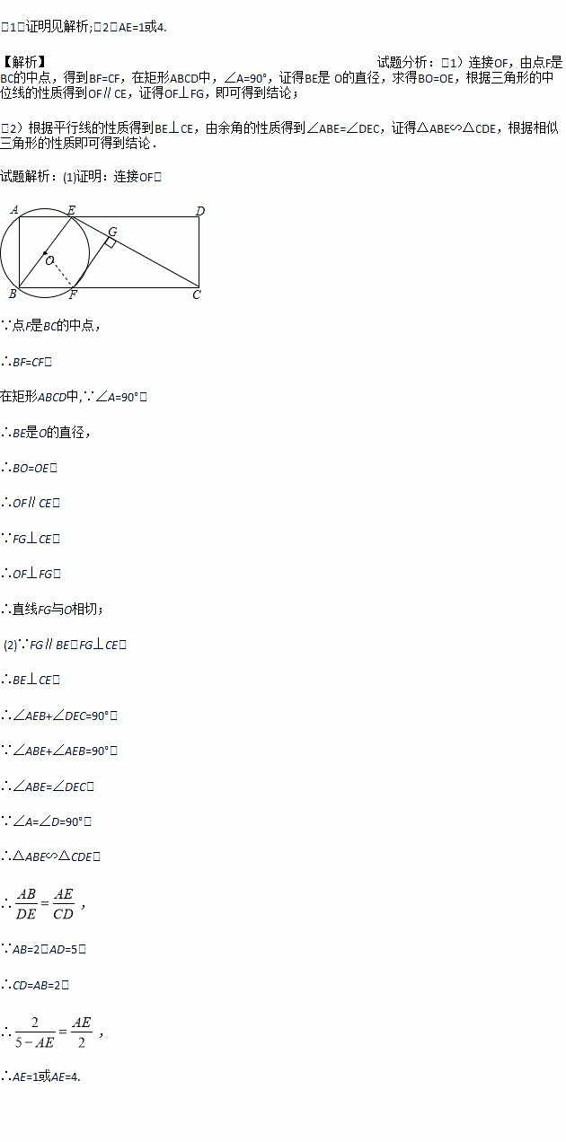 如图,在矩形ABCD中,AB=2,AD=5,过点A、B作⊙O,交AD、BC于点E、F,连接BE、CE,过点F作FG⊥CE,垂足为G.