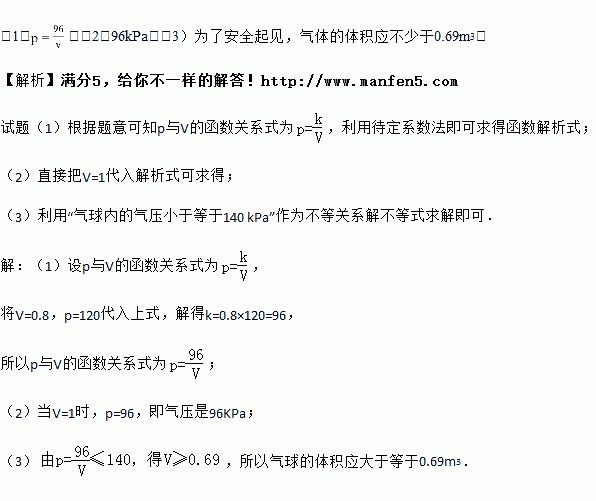 (3)当气球内的气压大于140kPa时,气球将爆炸,为了安全起见,气体的体积应不小于多少?(精确到0.01m3)
