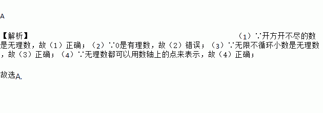 A 【解析】(1)∵开方开不尽的数是无理数,故(1)正确;(2)∵0是有理数,故(2)错误;(3)∵无限不循环小数是无理数,故(3)正确;(4)∵无理数都可以用数轴上的点来表示,故(4)正确; 故选A.