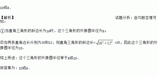 直角三角形的两边长分别为16和12,则此三角形的外接圆的半径是 .
