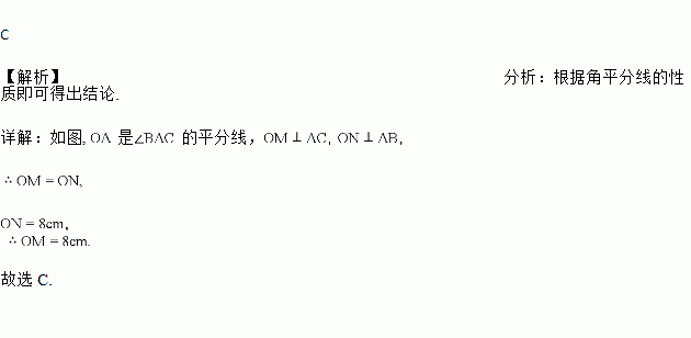 如图所示,OA是∠BAC的平分线,OM⊥AC于M,ON⊥AB于N,若ON=8cm,则OM长为( )