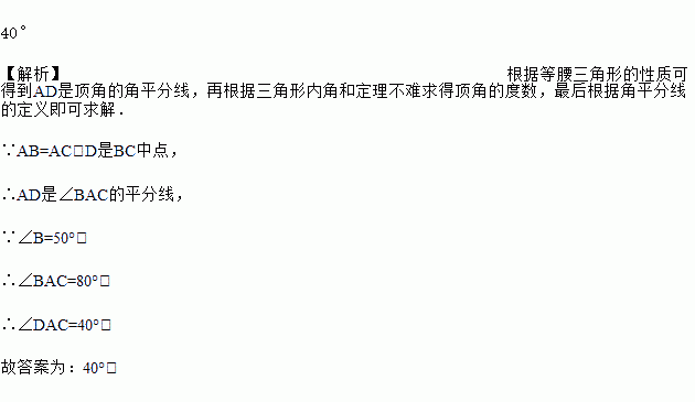 在△ABC中,AB=AC,点D是BC的中点,若∠B=50°,则∠DAC的度数是______.