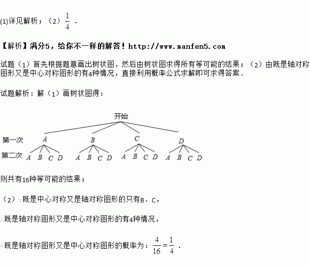 (1)用树状图(或列表法)表示两次摸牌所有可能出现的结果(纸牌可用A、B、C、D表示);