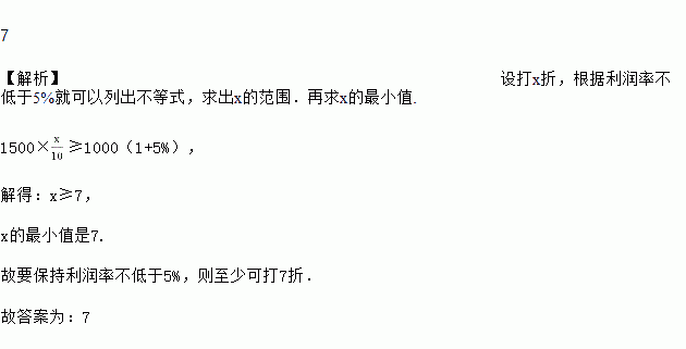 某种商品的进价为1000元,出售时的标价为1500元,后来由于该商品积压,商店准备打折出售,但要保持利润率不低于5%,则最少可打________折。