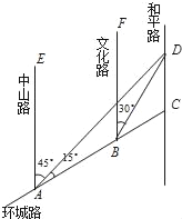 如图,AC是某市环城路的一段,AE,BF,CD都是南北方向的街道,其与环城路AC的交叉路口分别是A,B,C.经测量花卉世界D位于点A的北偏东45°方向,点B的北偏东30°方向上,AB=2km,∠DAC=15°.