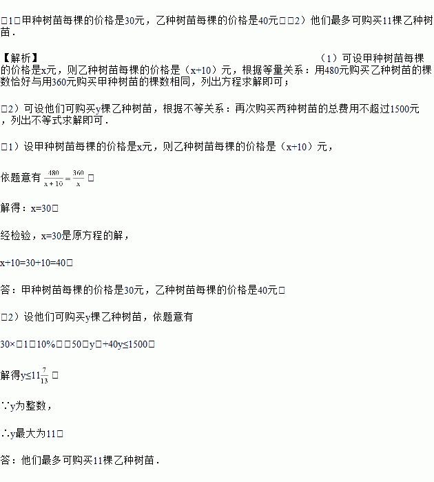 ijÇà´ºµ³Ö§²¿ÔÚ¾«×¼·öƶ»î¶¯ÖУ¬¸ø½á¶Ô°ï·öµÄƶÀ§¼ÒÍ¥ÔùËͼס¢ÒÒÁ½ÖÖÊ÷ÃçÈÃÆäÔÔÖÖ£®ÒÑÖªÒÒÖÖÊ÷ÃçµÄ¼Û¸ñ±È¼×ÖÖÊ÷Ãç¹ó10Ôª£¬ÓÃ480Ôª¹ºÂòÒÒÖÖÊ÷ÃçµÄ¿ÃÊýÇ¡ºÃÓëÓÃ360Ôª¹ºÂò¼×ÖÖÊ÷ÃçµÄ¿ÃÊýÏàͬ£®