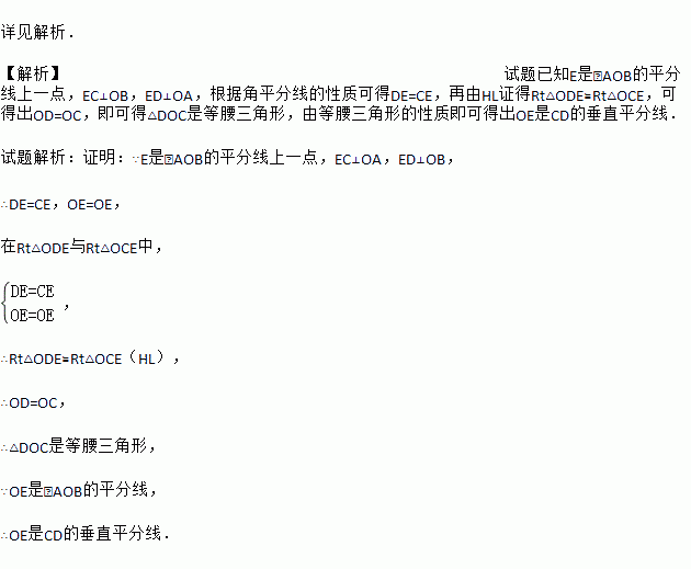 如图,已知E是∠AOB的平分线上的一点,EC⊥OA,ED⊥OB,垂足分别是C,D.求证:OE垂直平分CD.