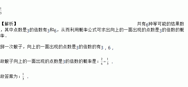 一枚质地均匀的正方体骰子,骰子的六个面上分别刻有1到6的点数,张兵同学掷一次骰子,骰子向上的一面出现的点数是3的倍数的概率是_____.