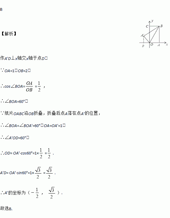 如图,把一矩形纸片OABC放入平面直角坐标系xoy中,使OA,OC分别落在x轴、y轴上,现将纸片OABC沿OB折叠,折叠后点A落在点A'的位置,若OA=1,OB=2,则点A'的坐标为( )