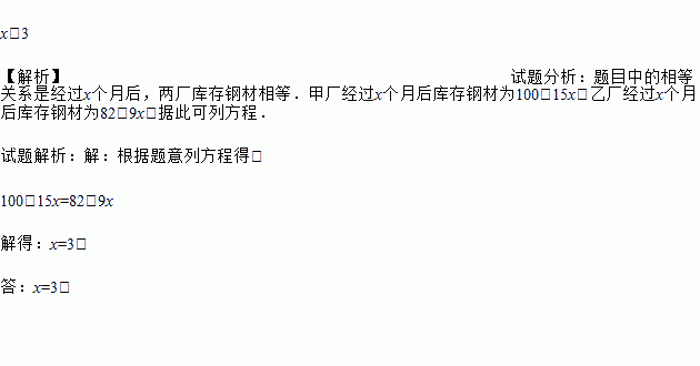 x=3 【解析】试题分析:题目中的相等关系是经过x个月后,两厂库存钢材相等.甲厂经过x个月后库存钢材为100﹣15x;乙厂经过x个月后库存钢材为82﹣9x.据此可列方程. 试题解析:【解析】 根据题意列方程得: 100﹣15x=82﹣9x 解得:x=3. 答:x=3.