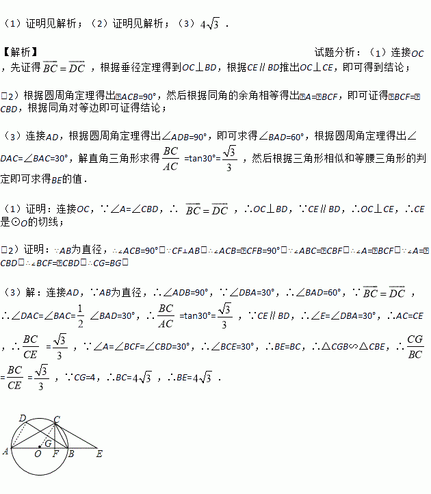 如图所示,以△ABC的边AB为直径作⊙O,点C在⊙O上,BD是⊙O的弦,∠A=∠CBD,过点C作CF⊥AB于点F,交BD于点G,过C作CE∥BD交AB的延长线于点E.