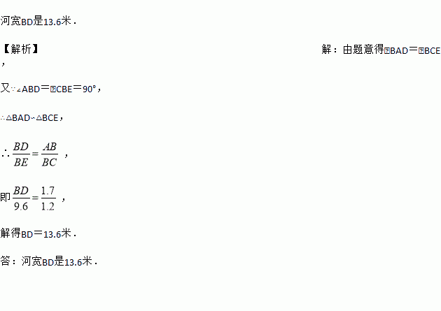 根据以上测量过程及测量数据,请你求出河宽BD是多少米?