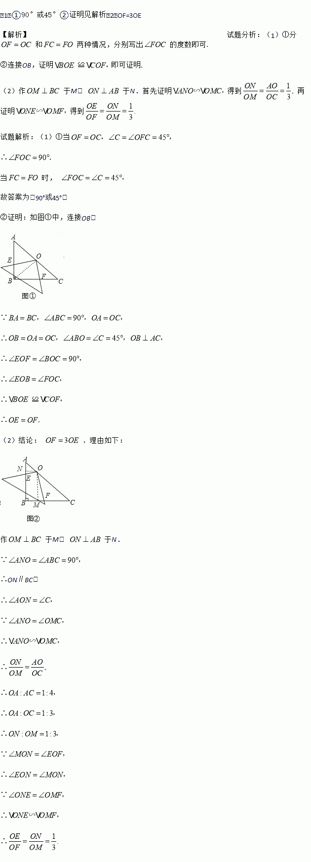 (2)如图②,若AO:AC=1:4时,OE和OF有怎样的数量关系?证明你发现的结论.