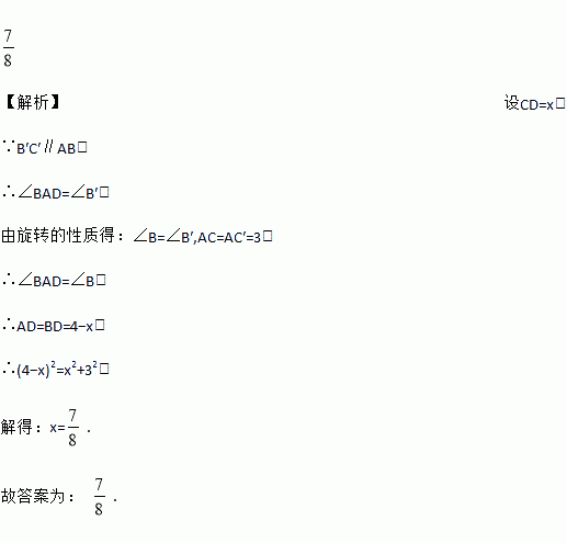 如图,Rt△ABC中,∠ACB=90°,AC=3,BC=4,将△ABC绕点A逆时针旋转得到△AB′C′,AB′与BC相交于点D,当B′C′∥AB时,CD= .