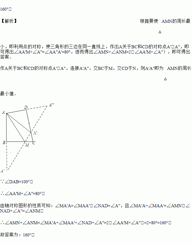 如图,AB⊥BC,AD⊥DC,∠BAD=100°,在BC、CD上分别找一点M、N,当△AMN的周长最小时,∠AMN+∠ANM的度数是_____.