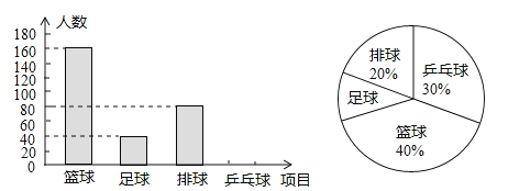 (8分)某校有学生2000名,为了了解学生在篮球、足球、排球和乒乓球这四项球类运动中最喜爱的一项球类运动情况,对学生开展了随机调查,丙将结果绘制成如下的统计图.