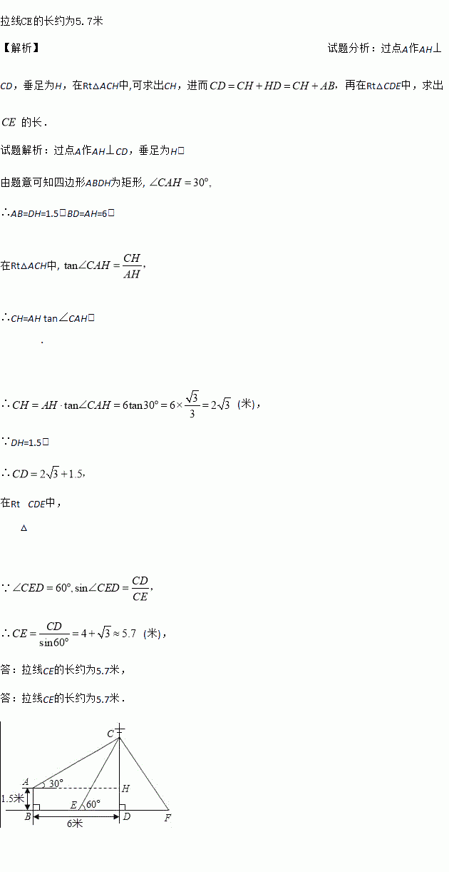 如图,在电线杆CD上的C处引拉线CE、CF固定电线杆,拉线CE和地面所成的角∠CED=60°,在离电线杆6m的B处安置高为1.5m的测角仪AB,在A处测得电线杆上C处的仰角为30°,求拉线CE的长.(结果保留根号)