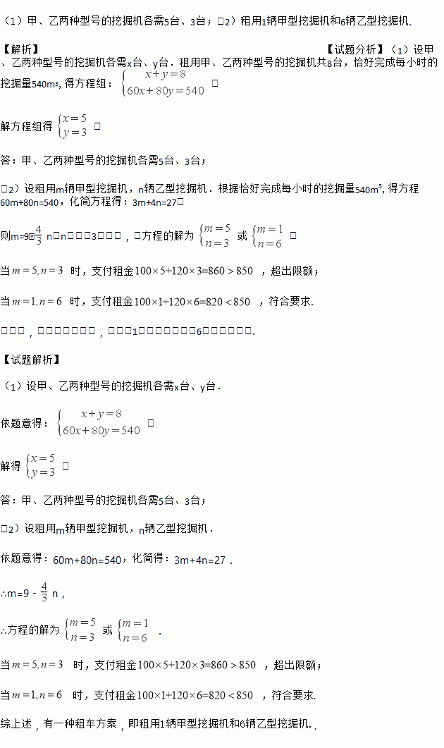 (2)如果每小时支付的租金不超过850元,又恰好完成每小时的挖掘量,那么共有哪几种不同的租用方案?