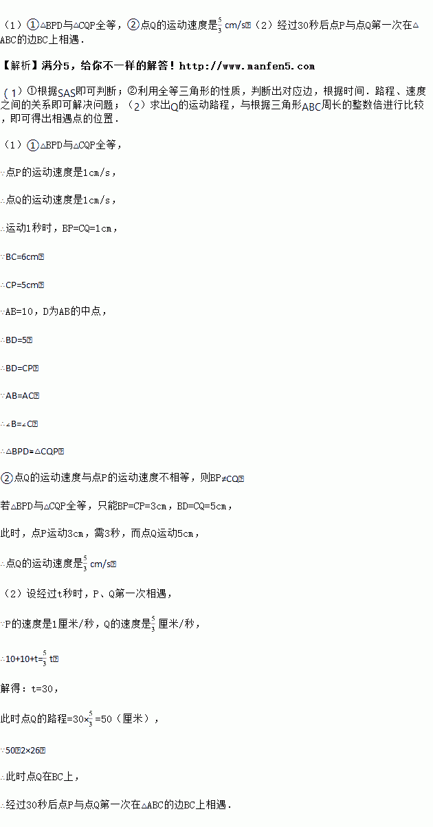 £¨1£©Èç¹ûµãPÔÚÏß¶ÎBCÉÏÒÔ1cm/sµÄËÙ¶ÈÓɵãBÏòµãCÔ˶¯£¬Í¬Ê±£¬µãQÔÚÏß¶ÎCAÉÏÓɵãCÏòµãAÔ˶¯£®