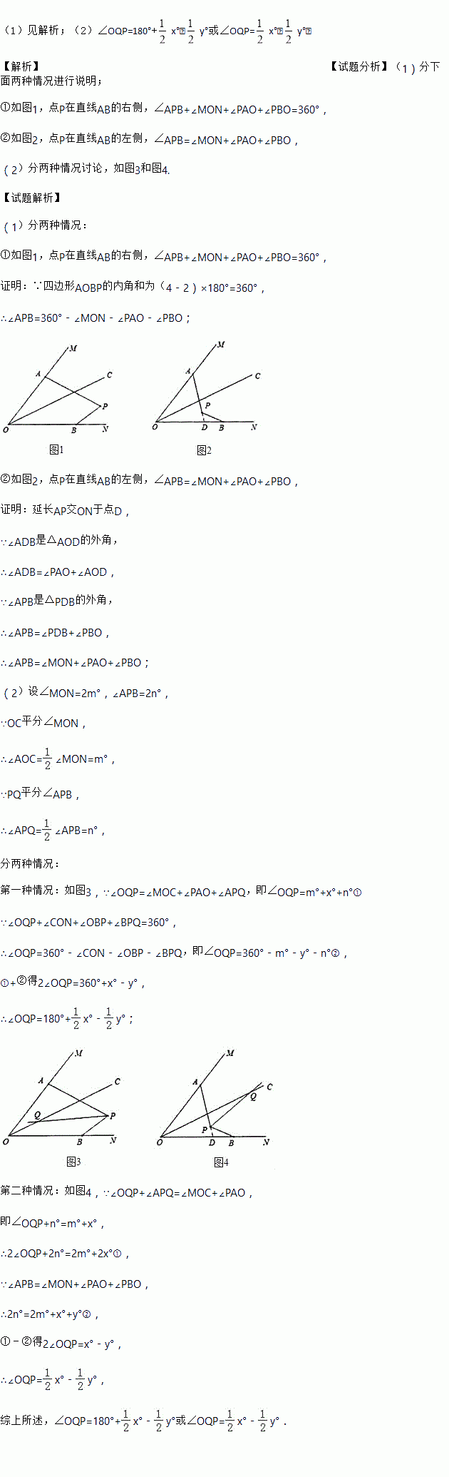 (2)设∠OAP=x°,∠OBP=y°,若∠APB的平分线PQ交OC于点Q,求∠OQP的度数(用含有x、y的代数式表示).