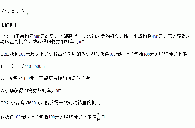 如图某商场为了吸引顾客,设立了一个可以自由转动的转盘,并规定:每购买500元商品,就能获得一次转动转盘的机会,如果转盘停止后,指针上对准500、20、100、50、10的区域,顾客就可以分别获得500元、200元、100元、50元、10元的购物券一张。(转盘等分成20份)