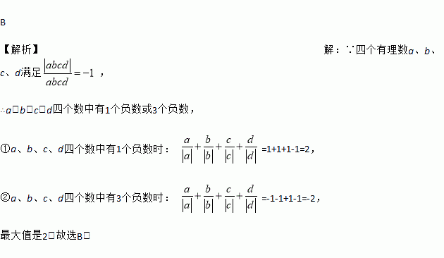 B 【解析】【解析】 ∵四个有理数a、b、c、d满足, ∴a、b、c、d四个数中有1个负数或3个负数, ①a、b、c、d四个数中有1个负数时: =1+1+1-1=2, ②a、b、c、d四个数中有3个负数时: =-1-1+1-1=-2, 最大值是2.故选B.