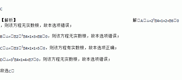 C 【解析】解:A.△=22﹣4×1×2=﹣6<0,则该方程无实数根,故本选项错误; B.△=(﹣2)2﹣4×1×3=﹣8<0,则该方程无实数根,故本选项错误; C.△=(﹣3)2﹣4×1×1=5>0,则该方程有实数根,故本选项正确; D.△=32﹣4×1×4=﹣7<0,则该方程无实数根,故本选项错误; 故选C.